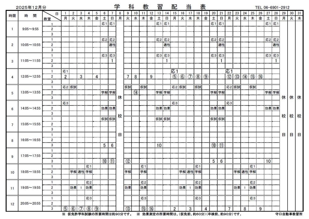 12月分 学科時間割表掲載しました。