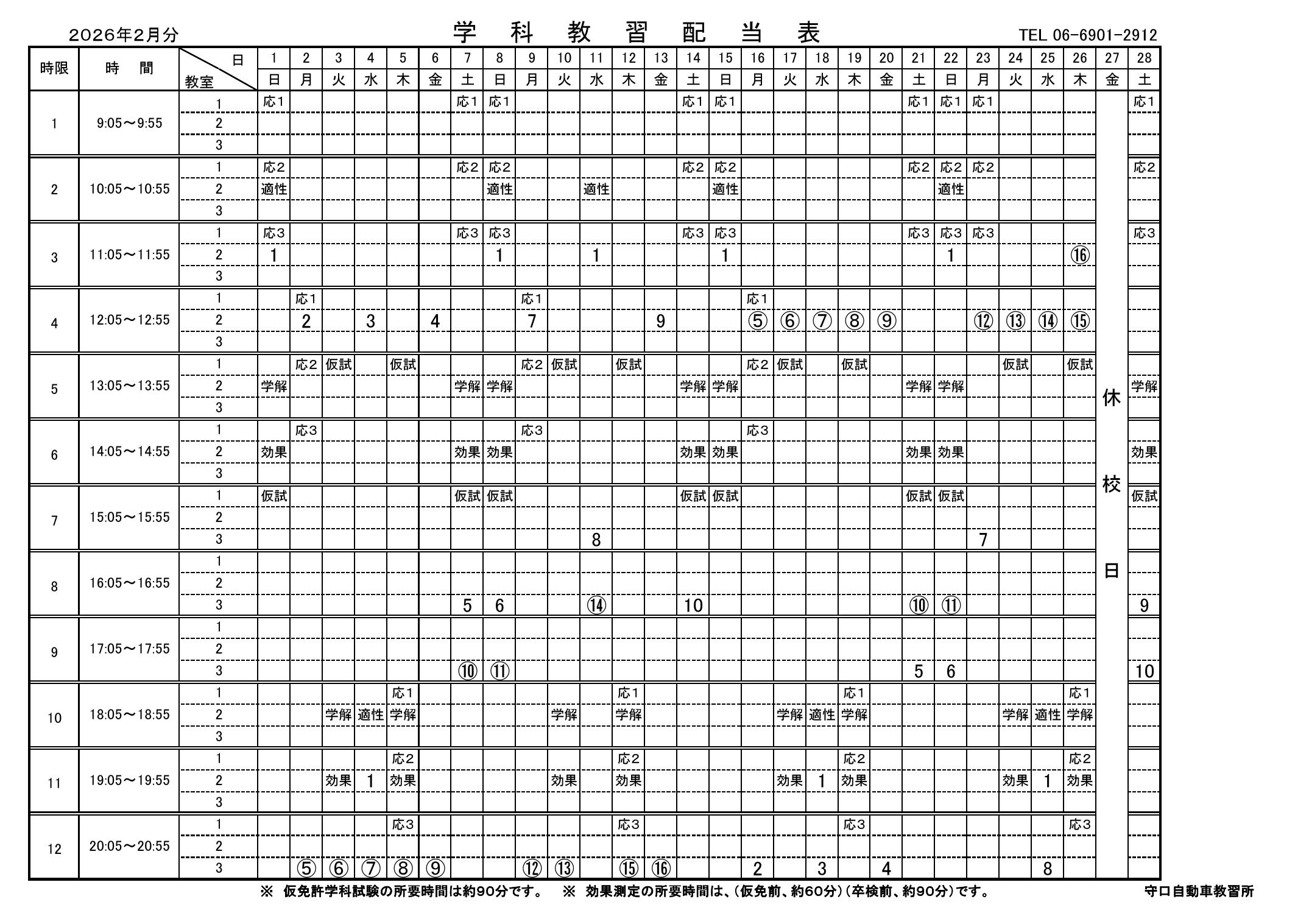 2026年 2月分学科配当表掲載しました