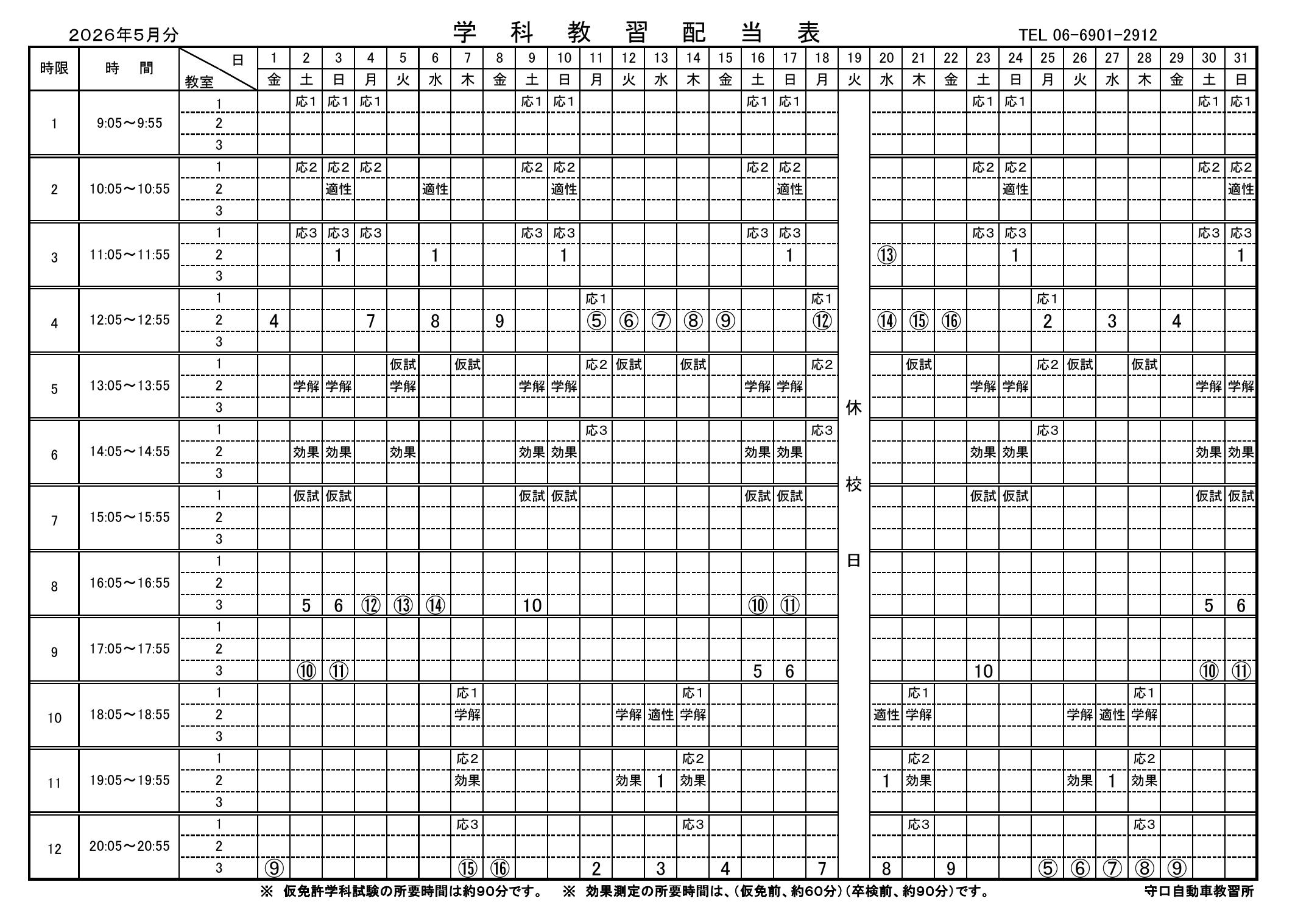 2026年 5月分学科配当表掲載しました。