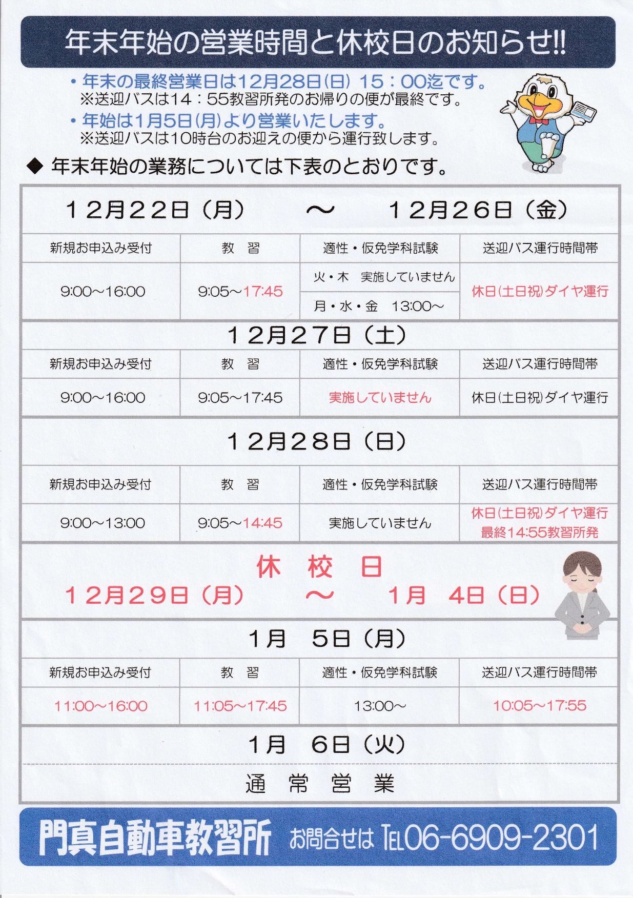 年末年始の営業時間と休校日のお知らせ!!