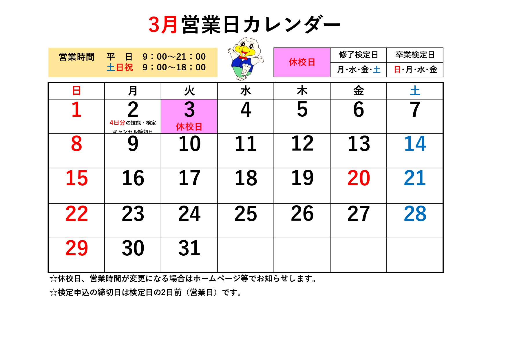 令和8年 3月のカレンダー