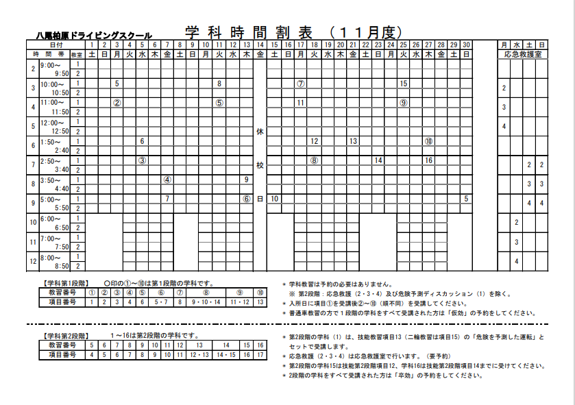 学科時間割表、2025年 11月分掲載しました。